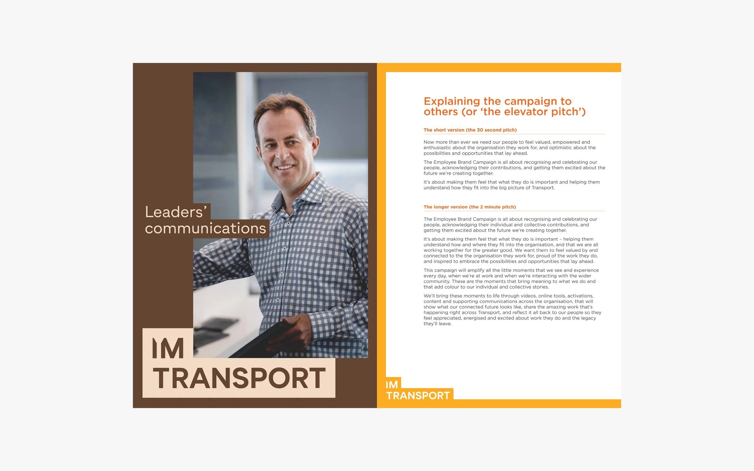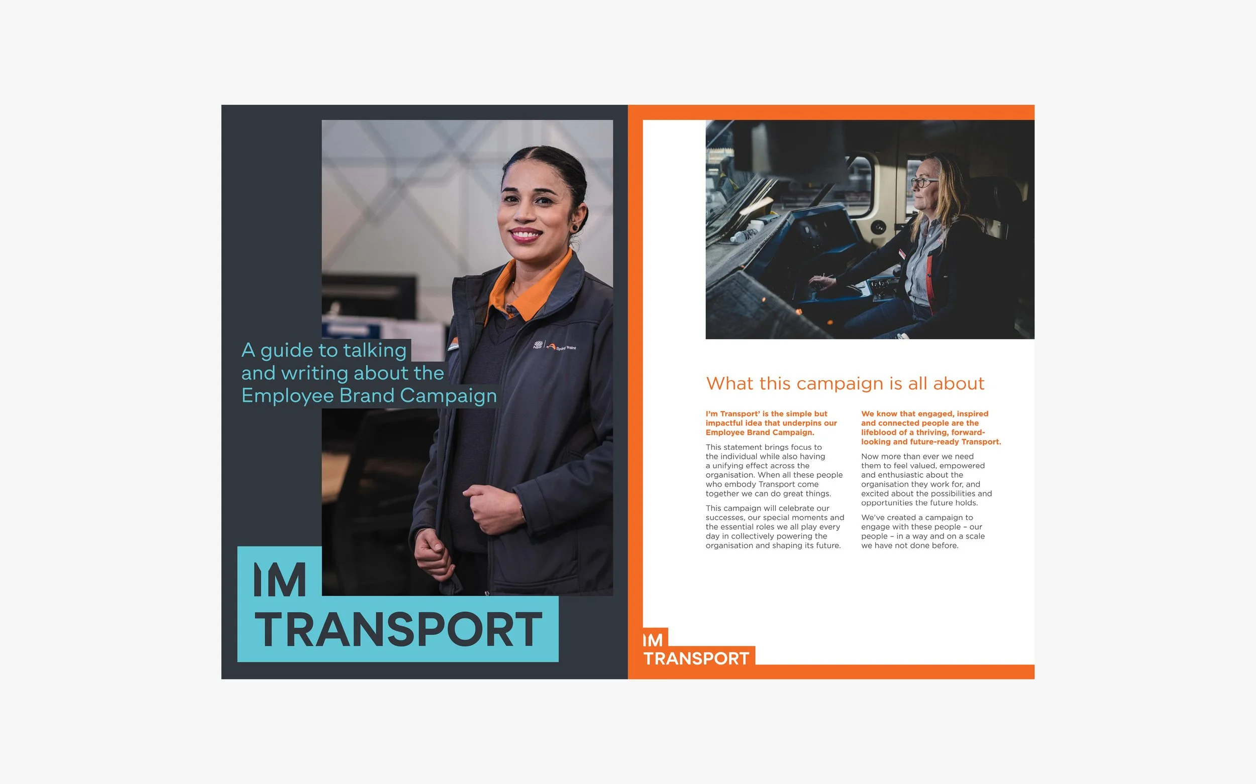 To address this, the Brand and Communication teams developed an employee campaign to unite staff under one culture and purpose and provide reassurance during change. After stakeholder workshops, three creative concepts were produced and tested across the cluster before selecting the final approach for launch. I’m Transport shown here aimed to deliver the acknowledgement staff were needing at the time, to see how they contributed to the bigger picture.